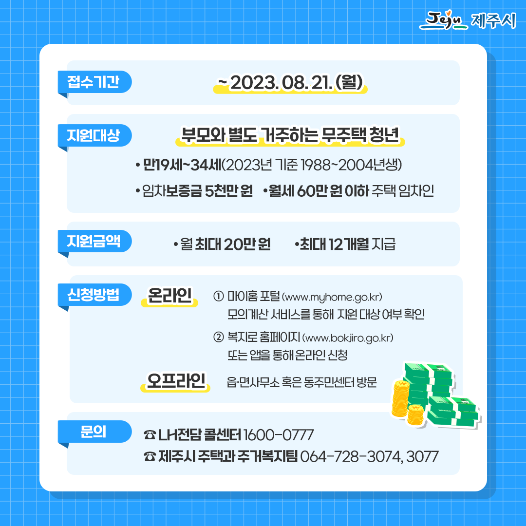 2023년 8월 21일 월요일까지 신청 접수를 받습니다. 지원대상은 부모와 별도로 거주하는 만 19세~34세(2023년 기준 1988~2004년생)의 무주택 청년 임차보증금 5000만 원, 월세 60만 원 이하의 주택 임차인을 대상으로 월 최대 20만 원, 최대 12개월 지급을 합니다.